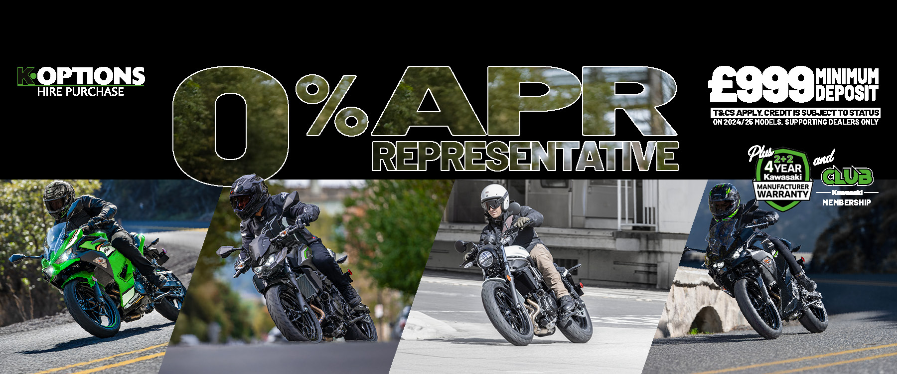Enjoy 0% APR on HP and 5.9% PCP APR Representative on a wide range of Kawasaki machines!