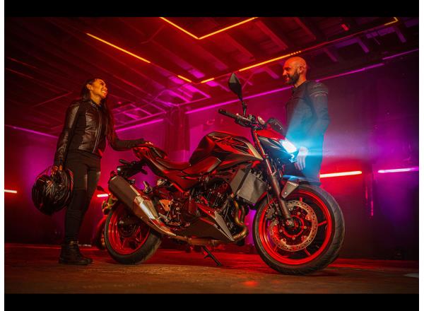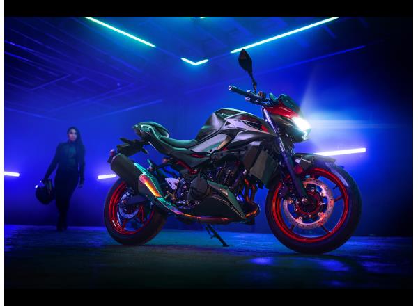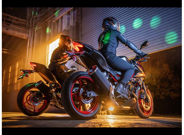 The new Z500 has a sharp, aggressive style and retains the large-volume design of other bikes in the Z series to create an aggressive, agile, street-oriented look. Its muscular, athletic bodywork reflects its performance while forming a flowing design that appears to float above the engine. Like other models in the Z Series, sugomi design elements (crouching stance, lowpositioned head and upswept tail) give it a silhouette instantly recognisable as a Kawasaki Supernaked.