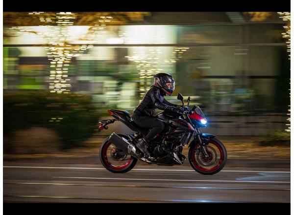 No matter from what angle the Z500 is seen, its triple headlightcentred front face and aggressive lines make it clear that this is a member of the Z family, with aggressive Supernaked looks and ample street presence.