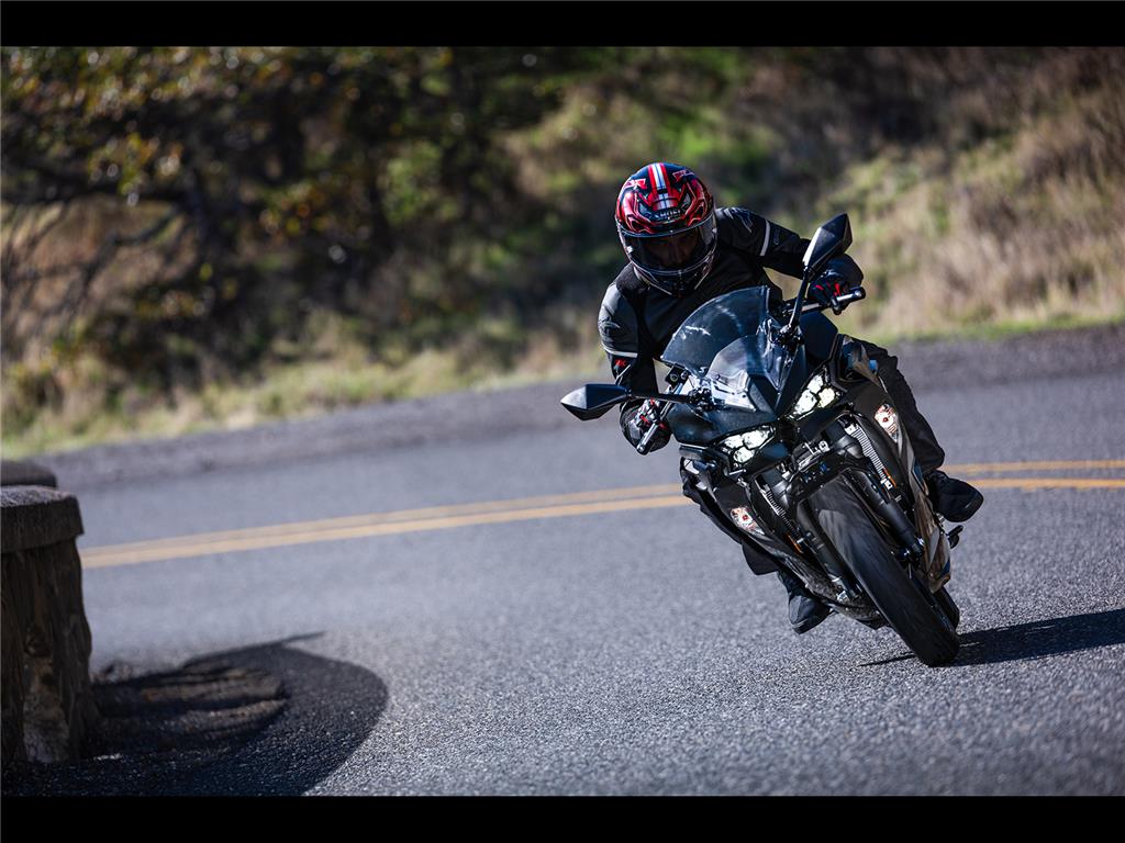 The Ninja 500’s “face” is based around two newly designed compact headlights. Below them two spoilers protrude forward and complete the striking look.