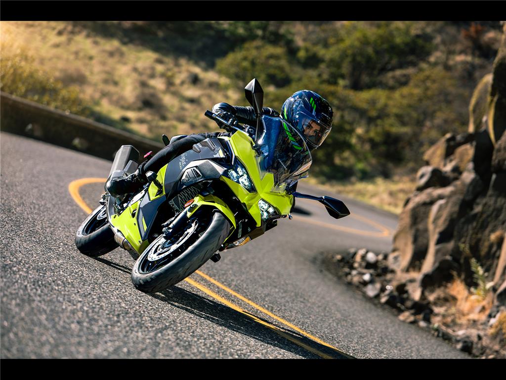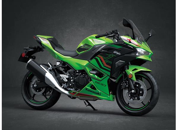 No matter from what angle the Ninja 500 is seen, its distinctive front face and sleek, flowing lines make it clear that this is a member of the Ninja family, with race-inspired, big-bike looks. The shape of the full-fairing bodywork fosters a sense of unity with the rider, helping them feel at one with the bike.
