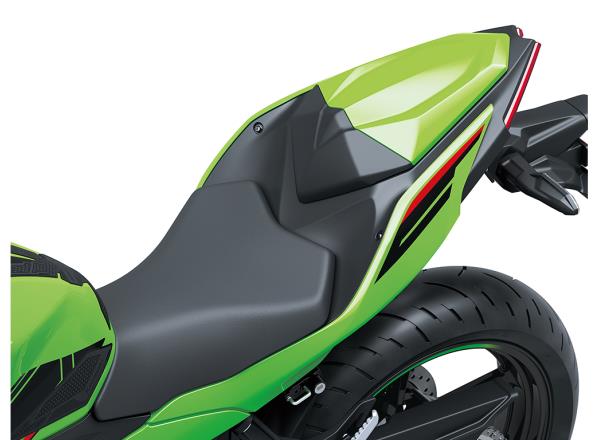 Seats with thick cushioning and low-rebound urethane contribute to superb ride comfort. The Ninja 500’s large volume bodywork also offers great wind protection, further contributing to ride comfort.