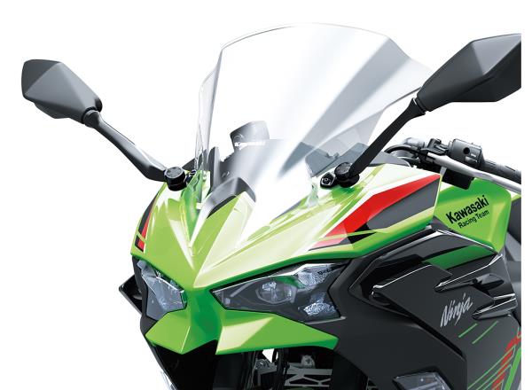 The Ninja 500’s “face” is based around two newly designed compact headlights. Below them two spoilers protrude forward and complete the striking look.