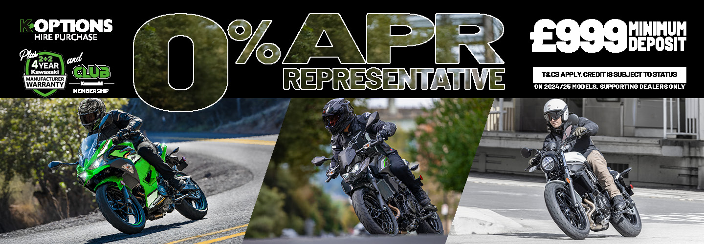 Enjoy 0% APR on HP and 5.9% PCP APR Representative on a wide range of Kawasaki machines!